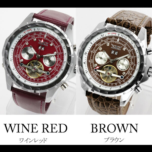 【送料無料】腕時計 時計 メンズ 自動巻き ミリタリー 革ベルト カレンダー WINNER ビッグフェイス 腕時計 BCG105 ブラウン レッド (ru-AC-W-BCG105m) ギミックの効いた仕上がり!デザイン性も◎【メール便送料無料】【代引き別途】