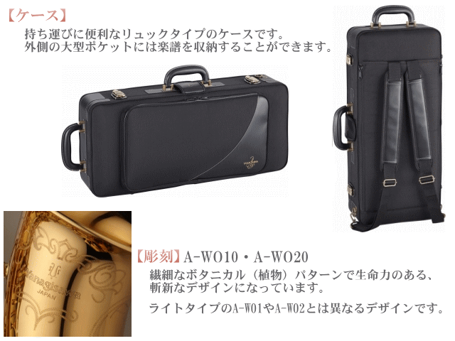 上記の通り、音程バランスや安定感、キイの操作性などを考慮し、改良された本機種はオススメです!■ヤナギサワWOシリーズ 各機種仕様比較仕様 /機種名A-WO1A-WO2A-WO10A-WO20モデルライトモデルライトモデルヘヴィモデルヘヴィモデル管体材質ベル彫刻ブラス製ブロンズ製ブラス製ブロンズ製彫刻なし彫刻なし彫刻あり彫刻ありネックその他C#-B連動キーダブルアームC#-B連動キーダブルアームメタルブースター■付属機能 説明項 目解 説テフロンインナーオクターブ機構オクターブキー軸の両端を球形状に加工し、さらに受け部にはテフロンを入れガタつきや雑音をなくし、スムーズなキーワークを実現しました。