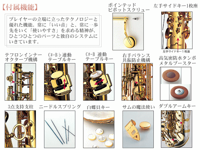 サムの魔法使い点で接する構造により、豊かな響きを実現した指掛けと、真鍮製で滑らかな吹き心地を実現し、音色のバラツキも少なくした拇指台の「サムの魔法使い」が標準装備となりました。