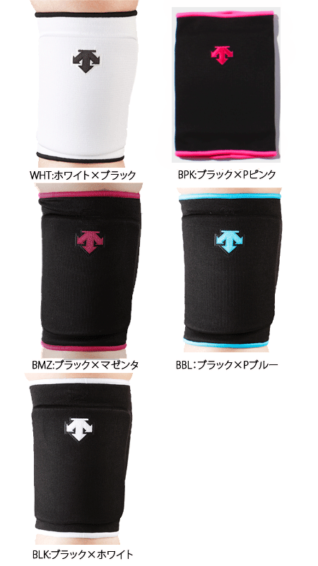 >バレーボール・デサント・膝サポーター【2個セット】■素材●本体:レーヨン・ポリエステル・ナイロン・ゴム●パッド:EVA■パッド厚み:10mm■マーク部:刺繍■カラー: WHT:ホワイト×ブラック BPK:ブラック×ピンク BMZ:ブラック×マゼンダ BBL:ブラック×Pブルー BLK:ブラック×ホワイト ■サイズ: フリー(全長22cm)■原産国:台湾■機 能:バレーボールの大人用ニーパッド(膝サポーター)です。